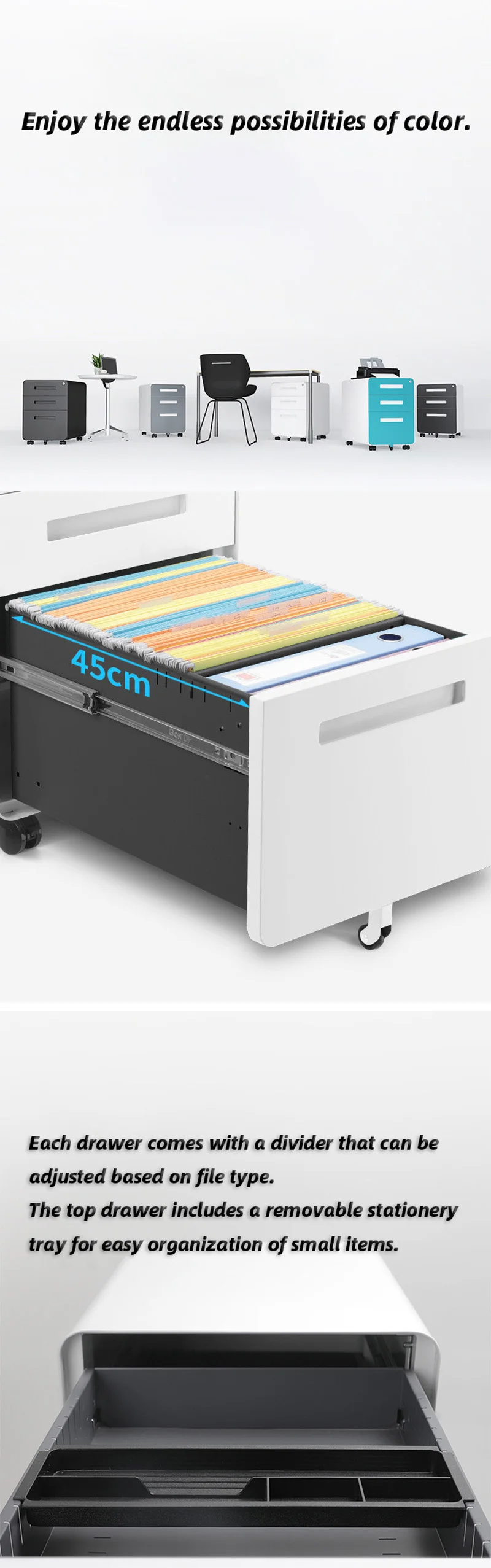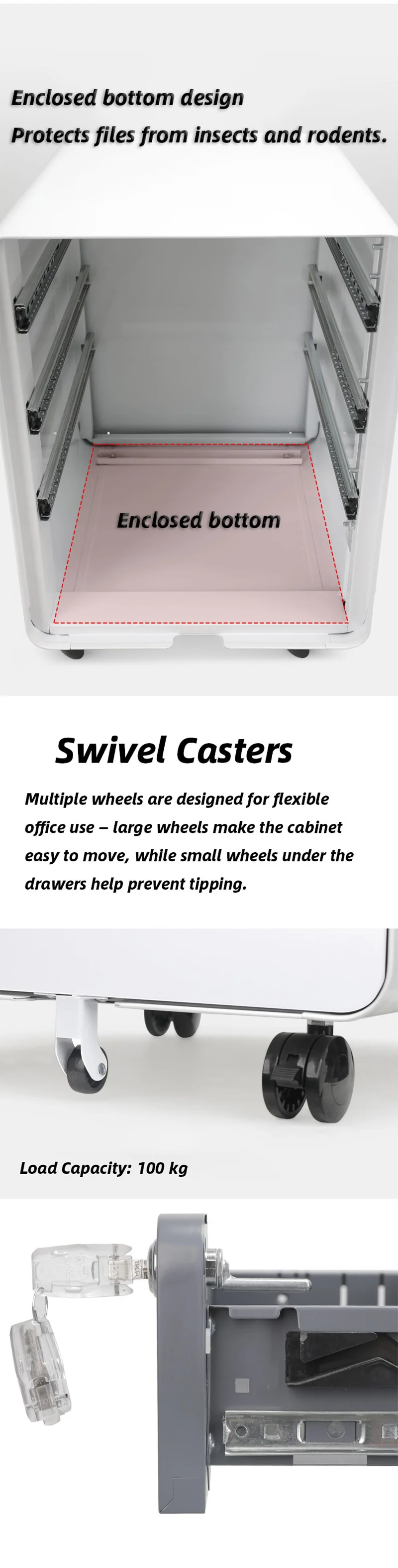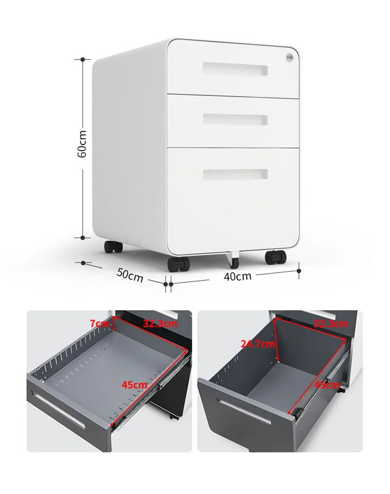 La Armario archivador móvil con 3 cajones con bloqueo y ruedas giratorias por el Pulage & Wanrui es una solución de almacenamiento versátil y duradera diseñada para mejorar la organización en oficinas, espacios de trabajo en casa, escuelas y hospitales. Fabricado con materiales de alta calidad acero Laminado en Frío (SPCC) con un acabado blanco liso con recubrimiento en polvo , este archivador combina funcionalidad, seguridad y movilidad. Su diseño compacto, equipado con tres cajones con cerradura y cuatro ruedas giratorias (dos con freno) , lo convierte en una opción ideal para profesionales que buscan un sistema de almacenamiento seguro, móvil y ecológico. Con opciones personalizables y un diseño contemporáneo, este armario se integra perfectamente en cualquier espacio de trabajo.