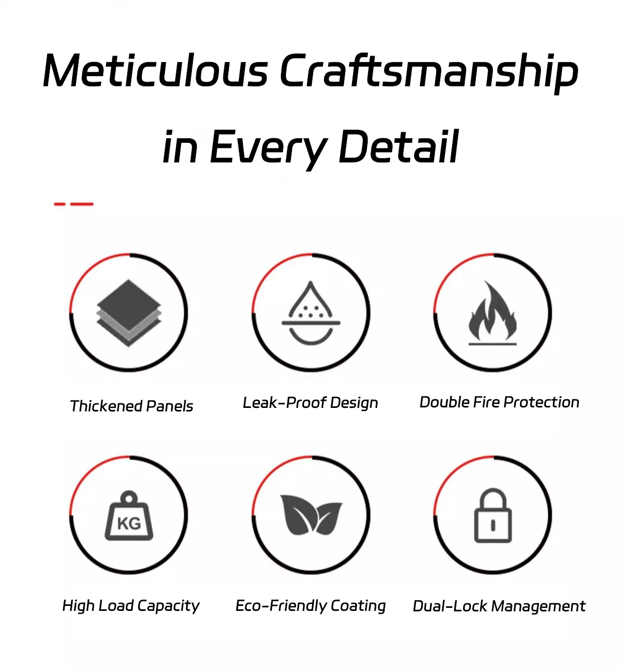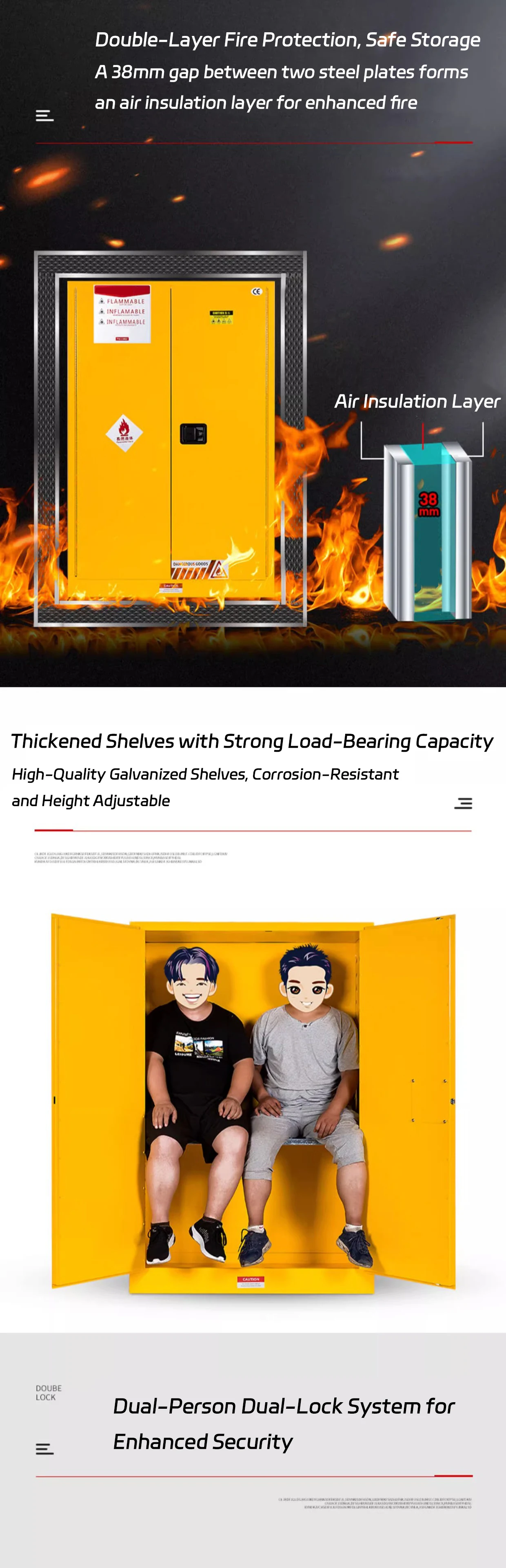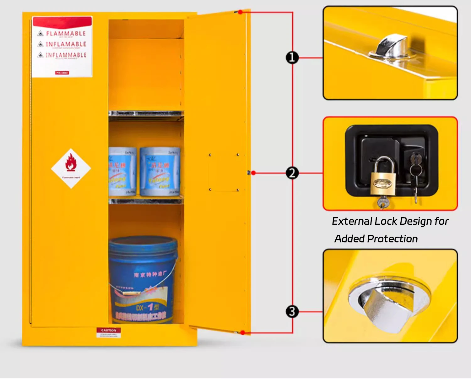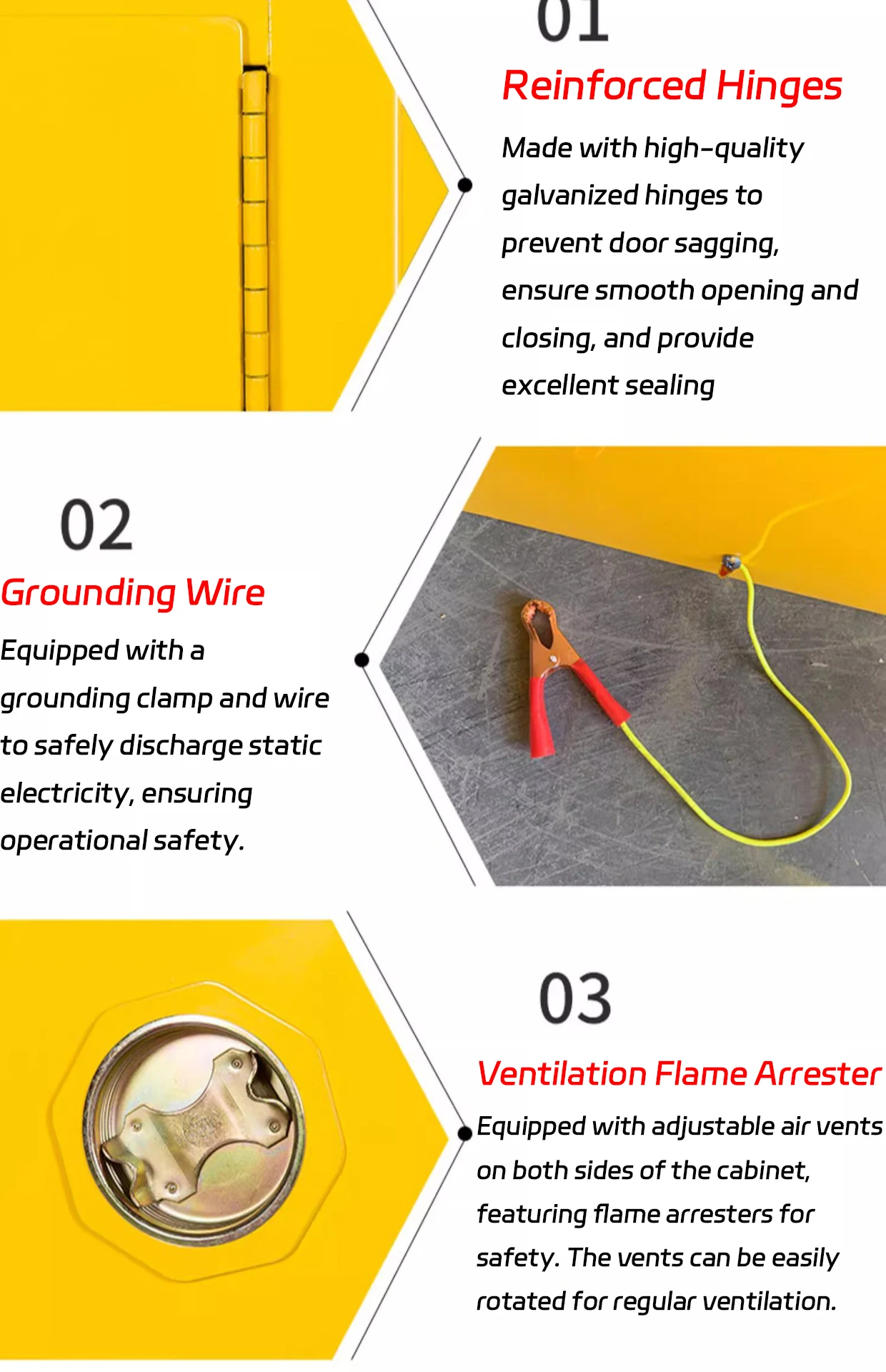 Características de seguridad : Diseño ignífugo y a prueba de explosiones; sistema de cierre de tres puntos para almacenamiento seguro de materiales peligrosos.