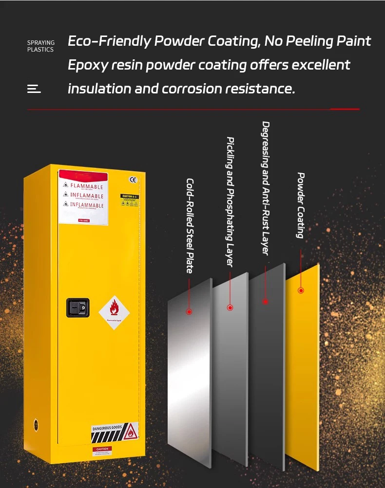 En entornos donde la seguridad y el cumplimiento son fundamentales, el armario metálico de seguridad química para almacenamiento de materiales peligrosos de PULAGE ofrece una solución rigurosa para alojar de forma segura sustancias inflamables y peligrosas. Diseñado en Henan, China, este armario de grado industrial está fabricado en acero laminado en frío con un acabado duradero de pintura electrostática en polvo, lo que garantiza una resistencia excepcional a la corrosión y al desgaste. Concebido para cumplir con normas estrictas de seguridad, incluyendo el cumplimiento de OSHA y NFPA 30, proporciona protección ignífuga y a prueba de explosiones, convirtiéndolo en un activo esencial para laboratorios, escuelas e instalaciones industriales que manipulan productos químicos, alcoholes o materiales relacionados con baterías.